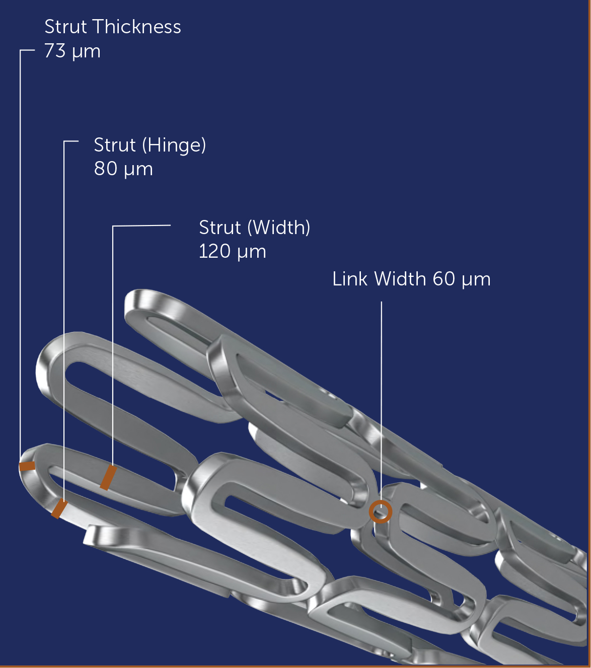 - Unique strut design for flexibility and larger surface area contact reducing plaque